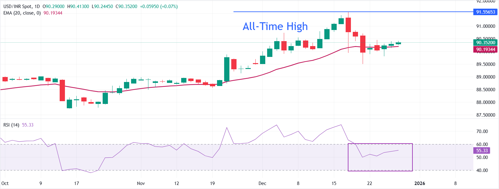 印度卢比(INR)在2025年最后一周开盘时对美元(USD)小幅走低
