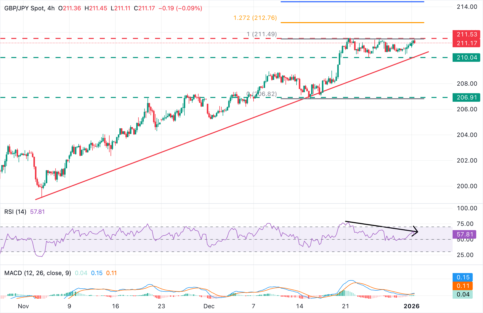 尽管新年市场整体低迷,英镑在对日元的交易中以温和的看涨趋势开启了新年,但仍受限于过去两周区间的顶部,即211.50区域。周五,日元在温和的市场情绪中处于弱势,交易量处于低水平,因为中国和日本的市场因新年庆祝活动而关闭。