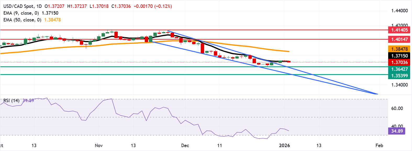 周五欧洲时段,美元/加元小幅下跌,交投于1.3700附近。日线图的技术分析显示出在看涨下降楔形模式上方的向上突破。14天相对强弱指数(RSI)为35.12,低于中线,反映出在从30以下读数回升后的动能疲弱。