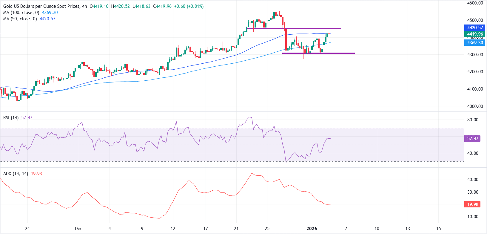 黄金(XAU/USD)在2026年第一完整交易周的开始时呈现看涨偏向,因美国与委内瑞拉之间的紧张局势加剧,推动了新的避险需求。在撰写本文时,黄金/美元交易价格约为4420美元,日内上涨近2%