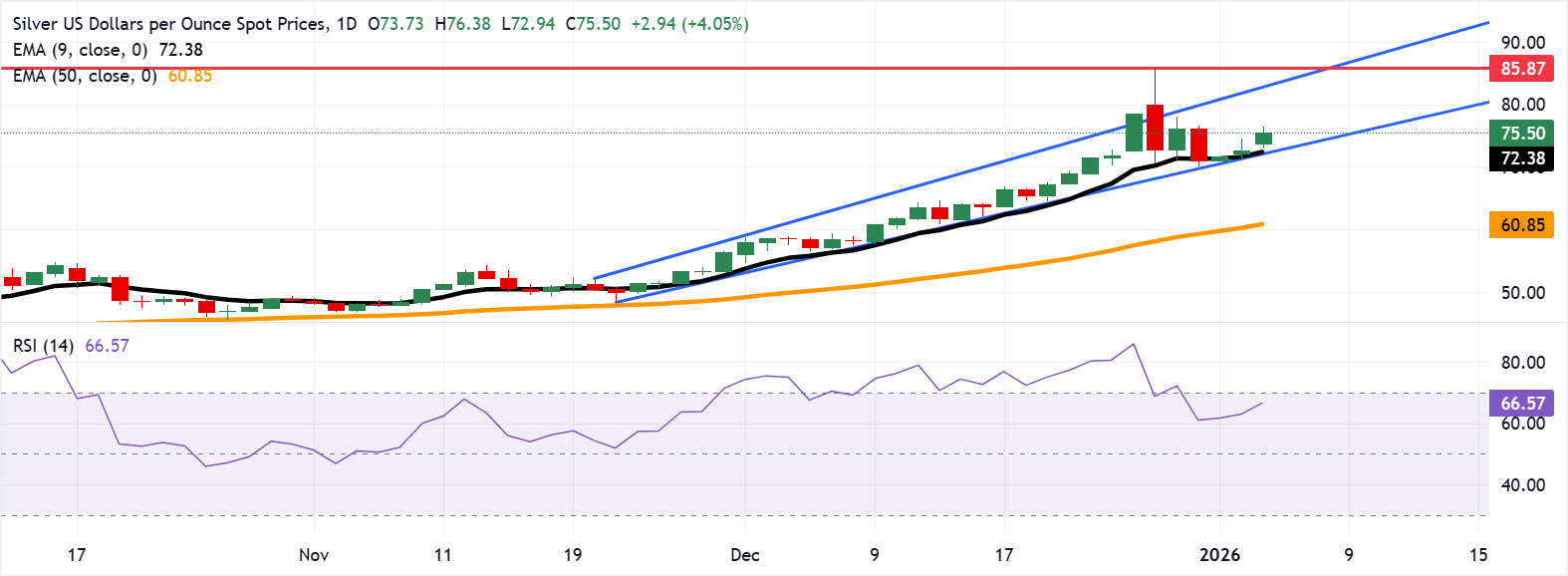 白银价格(XAG/USD)在周一欧洲交易时段上涨近4%,交易价格约为75.50美元。日线图的技术分析表明,这种贵金属的价格仍处于上升通道模式中,表明持续的看涨偏向。