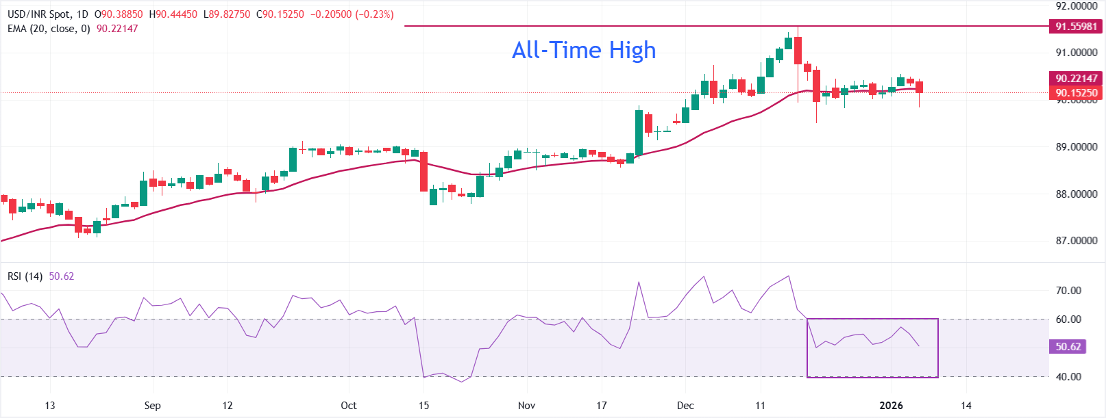 印度卢比(INR)在周三对美元(USD)大幅上涨,美元/印度卢比下跌近0.5%,接近89.80。根据路透社的报道,印度货币的走强是因为印度储备银行(RBI)干预以对抗美元/印度卢比的单边过度波动。