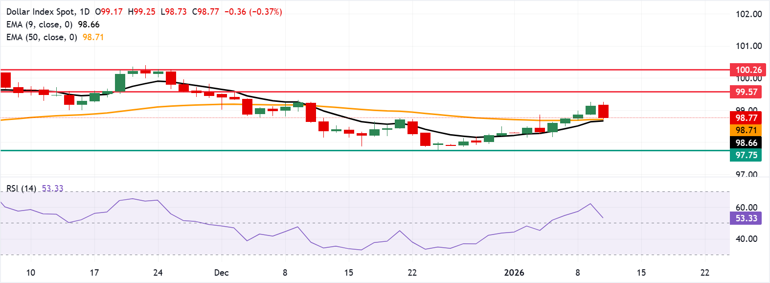 美国美元指数(DXY)衡量美元(USD)相对于六种主要货币的价值,在连续四天上涨后失去动能,周一欧洲时段交易在98.80附近