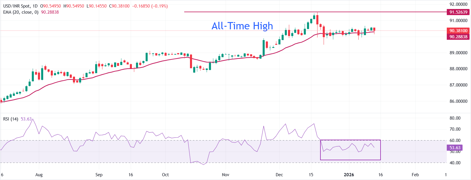 印度卢比(INR)在周三的开盘时段小幅走高,兑美元交易。由于周二美国(US)与印度之间的贸易谈判结果,美元/印度卢比(USD/INR)跌至接近90.40,印度卢比小幅上升。