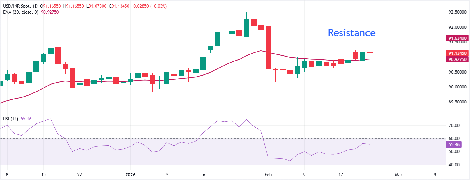印度卢比(INR)在周二对美元(USD)交易时表现脆弱。尽管外资大量流入印度股市,美元/印度卢比(USD/INR)对在91.10附近保持了周一的涨幅。