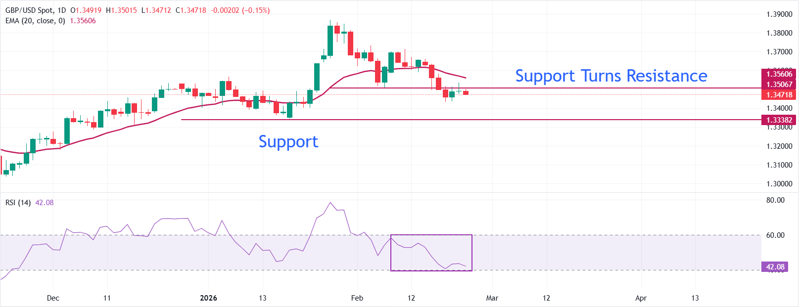 在欧洲交易时段,英镑/美元小幅下滑至接近1.3480。由于英镑(GBP)在市场上普遍不确定,且市场对英国央行(BoE)可能在短期内实施多次降息的预期增强,该货币对承压。