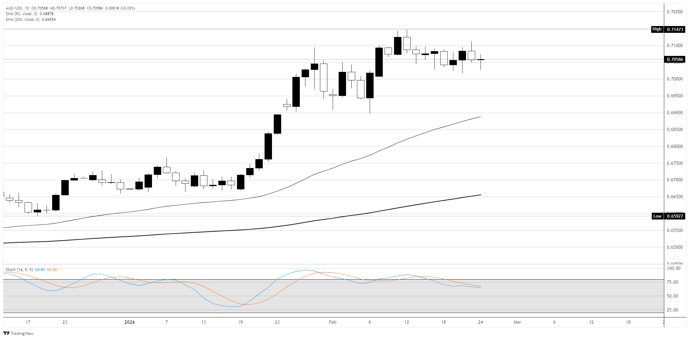 周二,澳元/美元小幅上涨不足 0.1%,在 0.7060 附近窄幅波动。