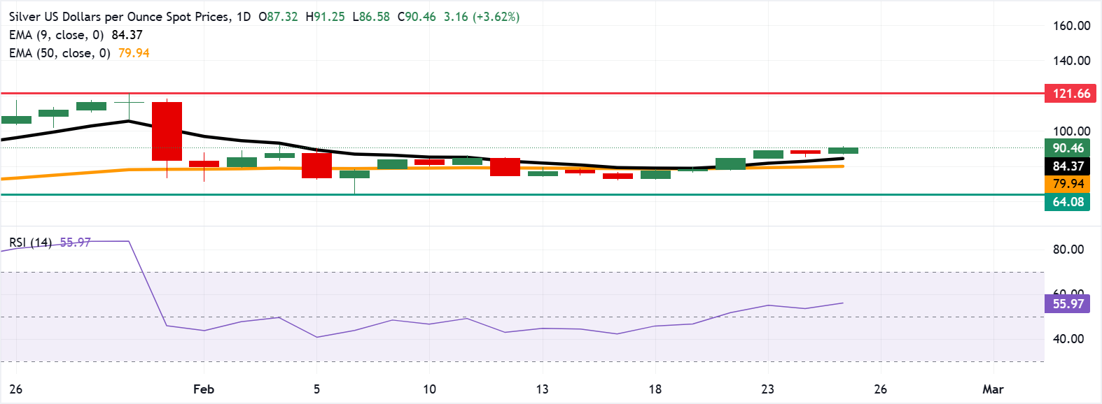 白银价格(白银/美元)在周三早盘欧洲时段恢复了前一交易日的近期跌幅,交投于每盎司90.50美元附近。日线图的技术分析显示,14日相对强弱指数(RSI)在56附近交易,位于中线之上,未接近超买区域,这支持了持续的买入兴趣,并在动能看似拉伸之前留有进一步上涨的空间。