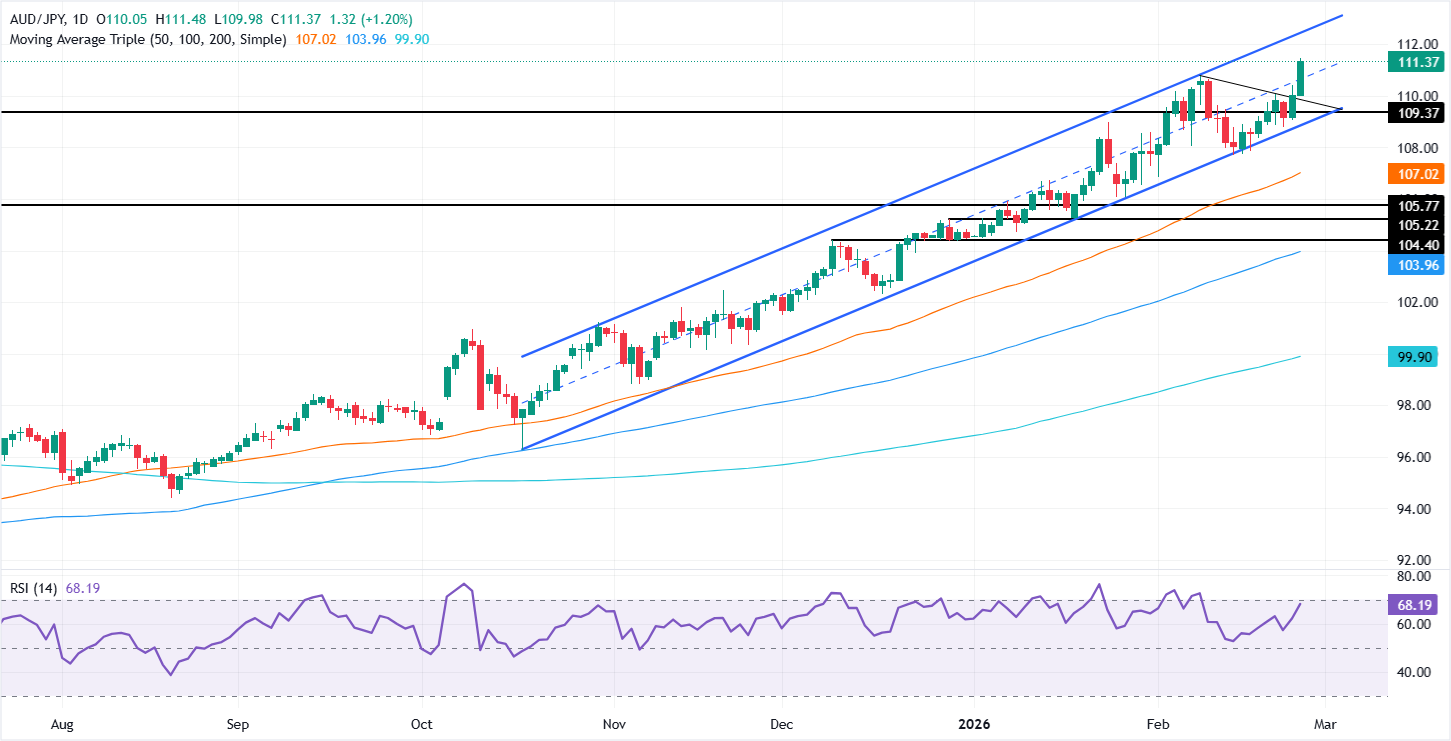 周三,澳元/日元上涨超过1.20%,因澳大利亚的通胀报告促使投资者预计澳储行(RBA)将进一步加息。撰写本文时,该交叉汇率交易于111.38。
