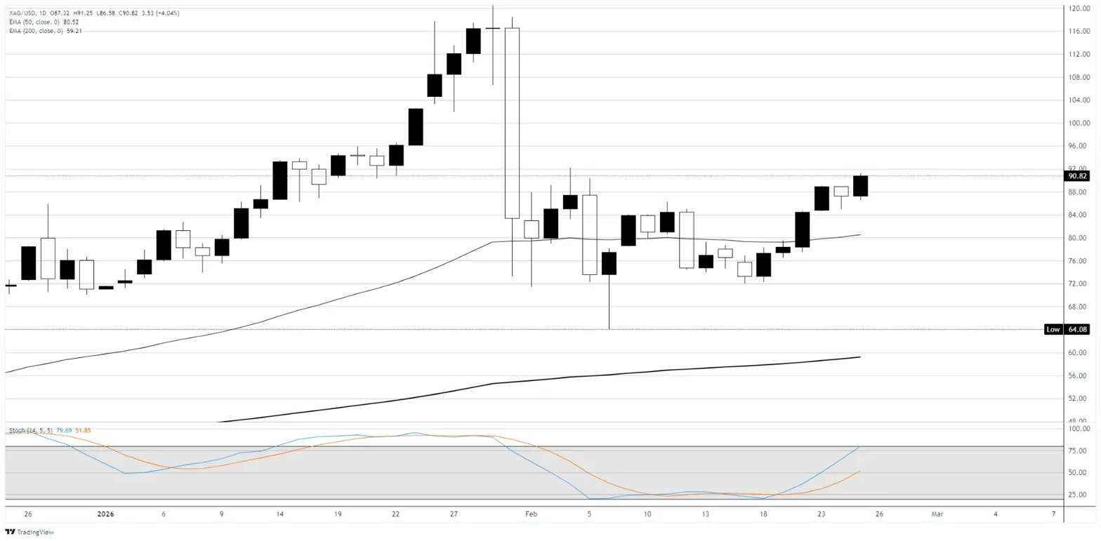 周三,白银/美元(XAG/USD)上涨约4%,在安全避险需求重新升温的推动下急剧反弹,收盘接近91美元。该货币对自1月底崩盘以来一直在恢复,当时价格从超过121美元的历史高点暴跌至2月初约64美元的低点,跌幅约为47%