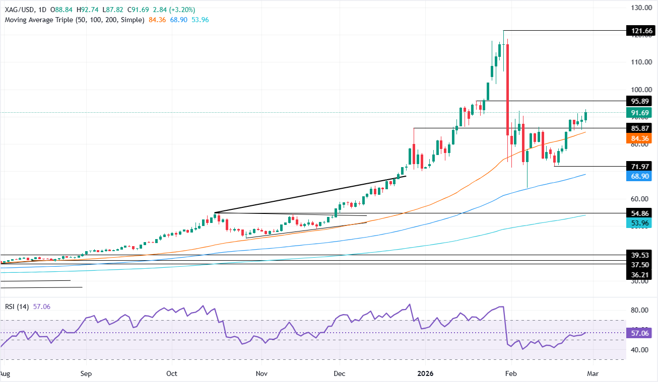 白银价格(白银/美元)在周五连续第三日上涨,此前美国最新的通胀报告促使投资者寻求这种贵金属的安全避风港,而美元保持坚挺。撰写时,XAG/USD交投于91.39美元附近,涨幅接近3%
