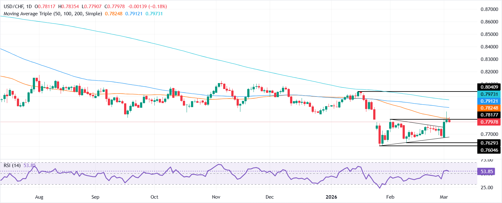 美元/瑞郎周三回撤,跌幅为0.25%,因该货币对未能在0.7819的50日简单移动均线(SMA)上方收盘。由于避险情绪,美元削减了周三的一些涨幅