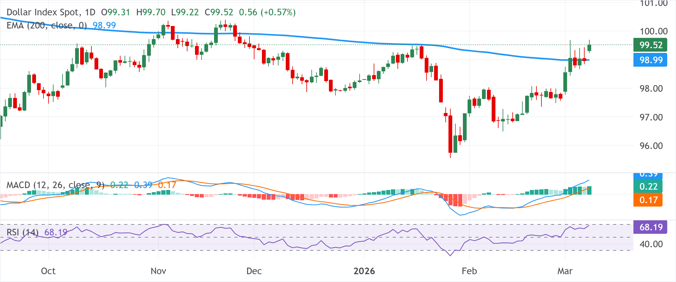 美元指数(DXY)追踪美元对一篮子货币的表现,在新的一周开始时以看涨缺口开盘,并触及自2025年11月以来的新高,约在99.70区域。该指数在欧洲交易时段的前半段保持了日内涨幅,并似乎有进一步升值的趋势。