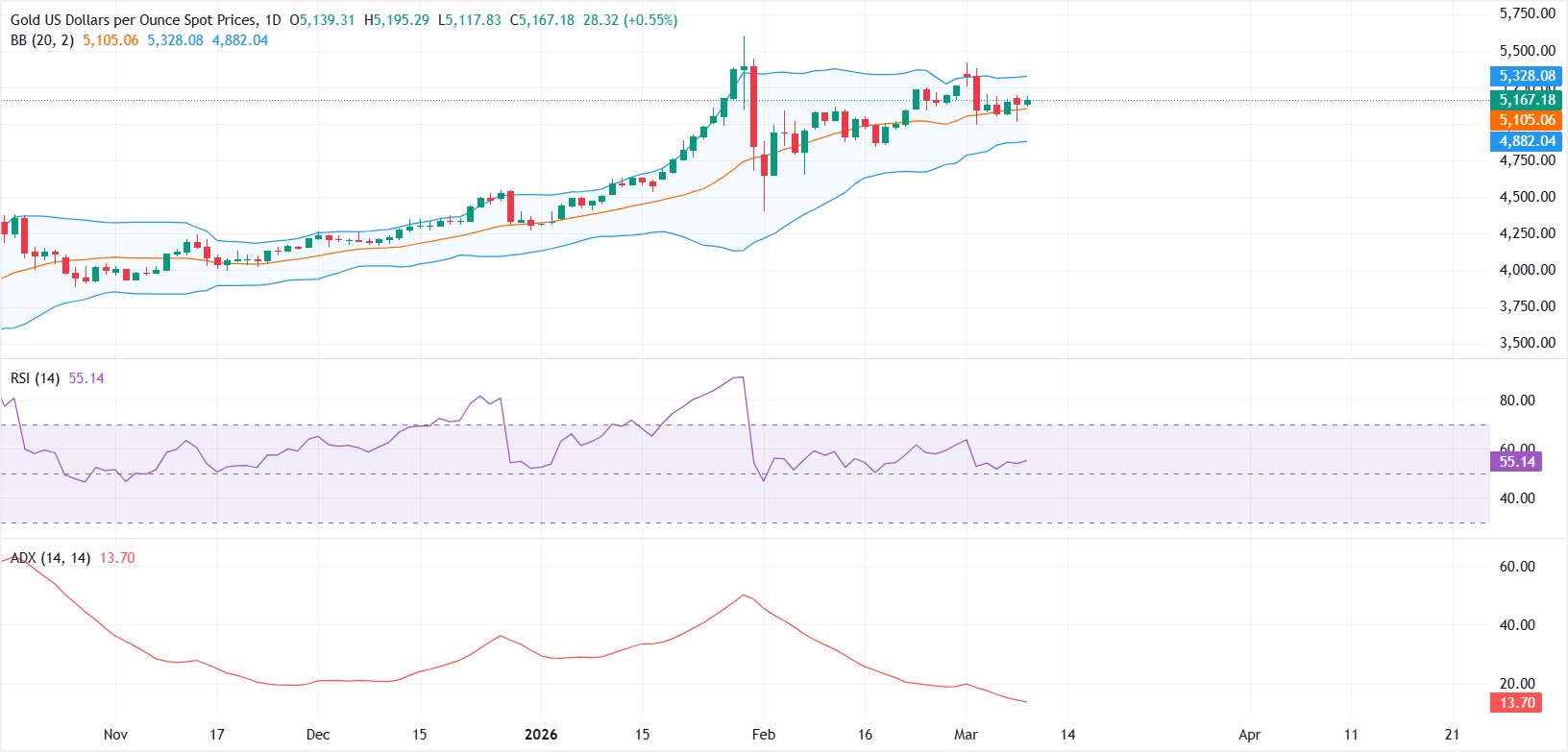 黄金(黄金/美元)在周二表现坚挺,延续了前一天从5000美元附近反弹的势头。这种贵金属受到疲软美元(USD)和低迷国债收益率的支撑,而持续的美伊战争使市场情绪保持谨慎,并继续缓解下行压力。