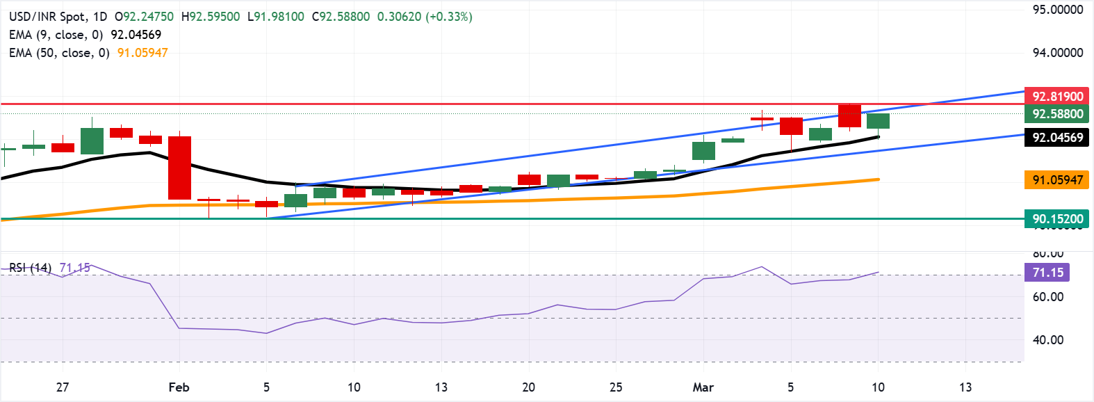 美元兑印度卢比(USD/INR)在前一交易日小幅下跌后反弹。然而,该货币对在周一达到了92.81的历史新高,因印度卢比(INR)在风险厌恶加剧和油价上涨的背景下面临强烈的卖压。近期油价的飙升仍然是印度卢比走弱的一个关键因素,因为印度在满足其能源需求方面严重依赖石油进口,对油价变化高度敏感。