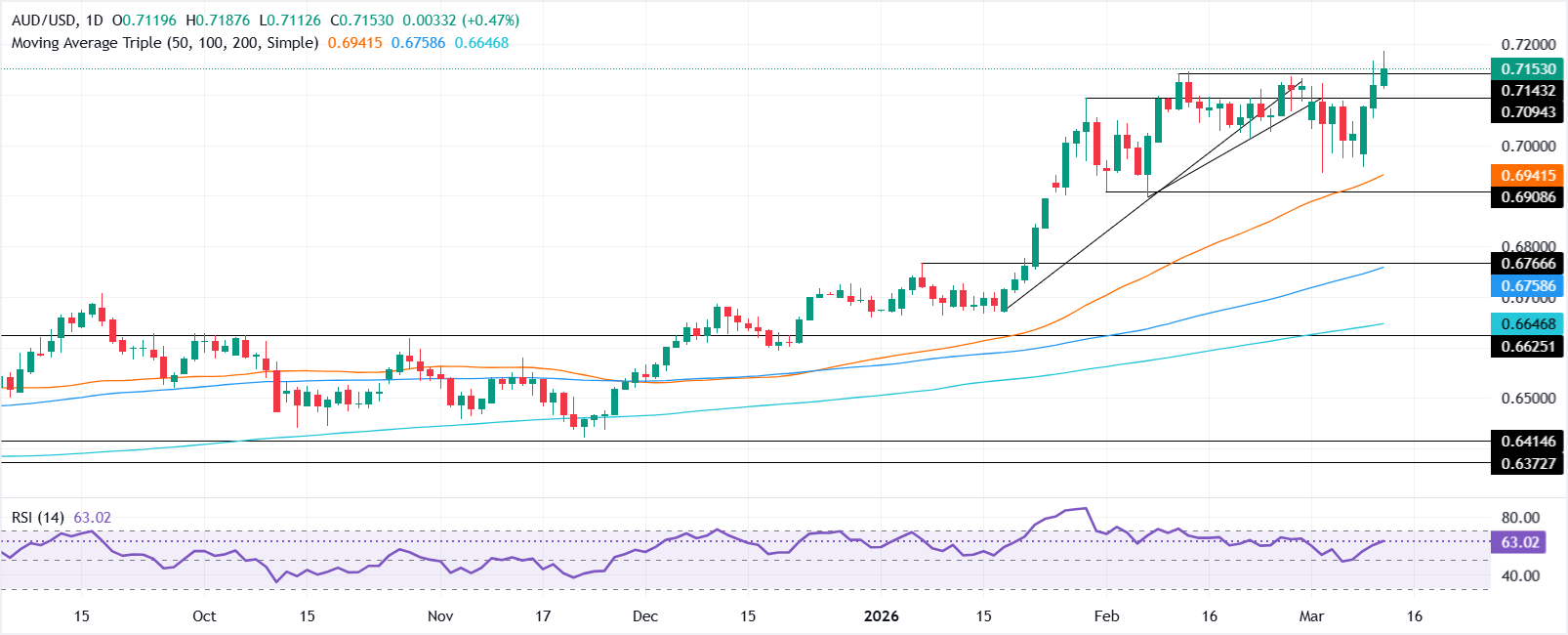 澳大利亚美元(AUD)在周三延续涨势,因市场对澳储行(RBA)将在下周会议上加息的猜测不断增加。撰写时,澳元/美元报0.7152,上涨0.47%
