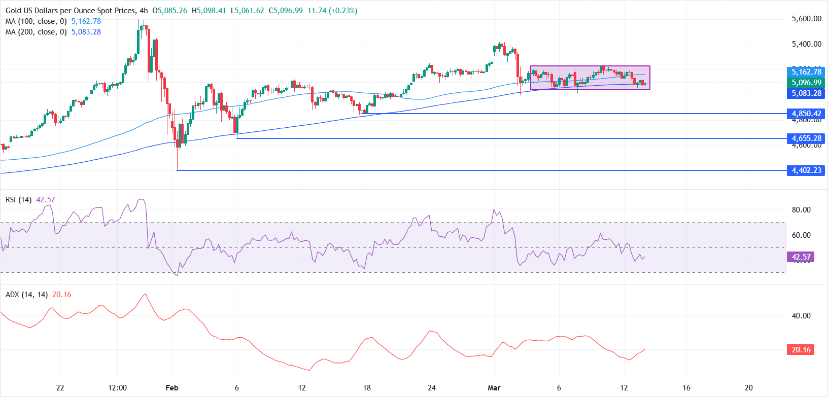 黄金(黄金/美元)在周五难以获得动力,仍在迈向连续第二周的下跌,因为由于美国与伊朗之间的战争导致油价飙升,引发了通胀担忧,并触发了全球利率预期的鹰派重新定价,给无收益的金属施加了压力。