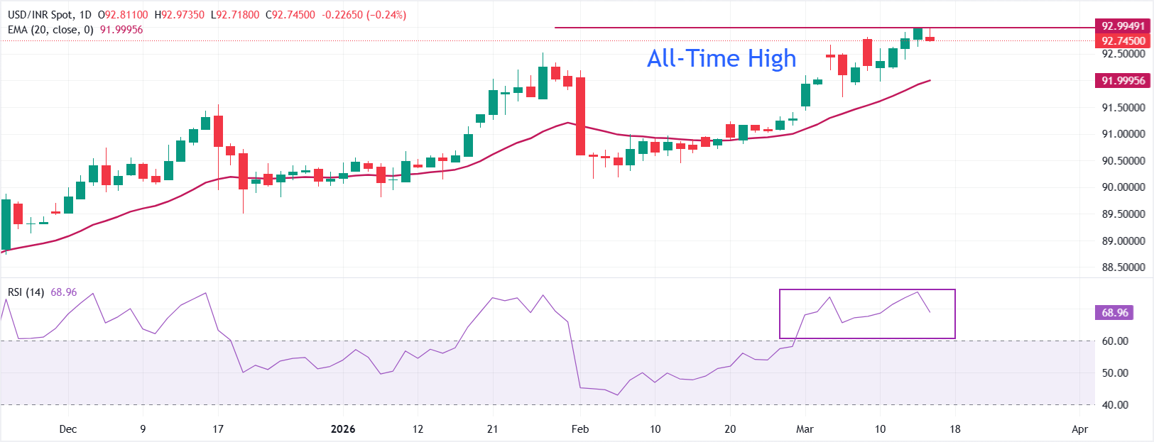 印度卢比(INR)在周一结束了对美元(USD)连续四天的下跌走势。美元/印度卢比交易下跌至接近92.70,因印度卢比在霍尔木兹海峡可能很快重新开放的猜测中反弹。