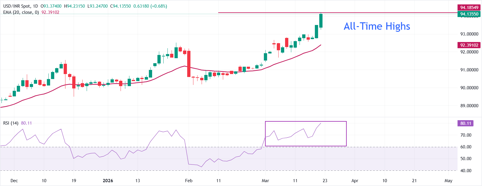 印度卢比(INR)在周五延续兑美元(USD)的下跌走势,此前一天为假期。美元兑印度卢比(USD/INR)汇率升至接近94.23的历史高点,印度货币持续面临来自印度股市持续外资流出和中东冲突导致油价上涨的显著压力,以及美元的强劲反弹。