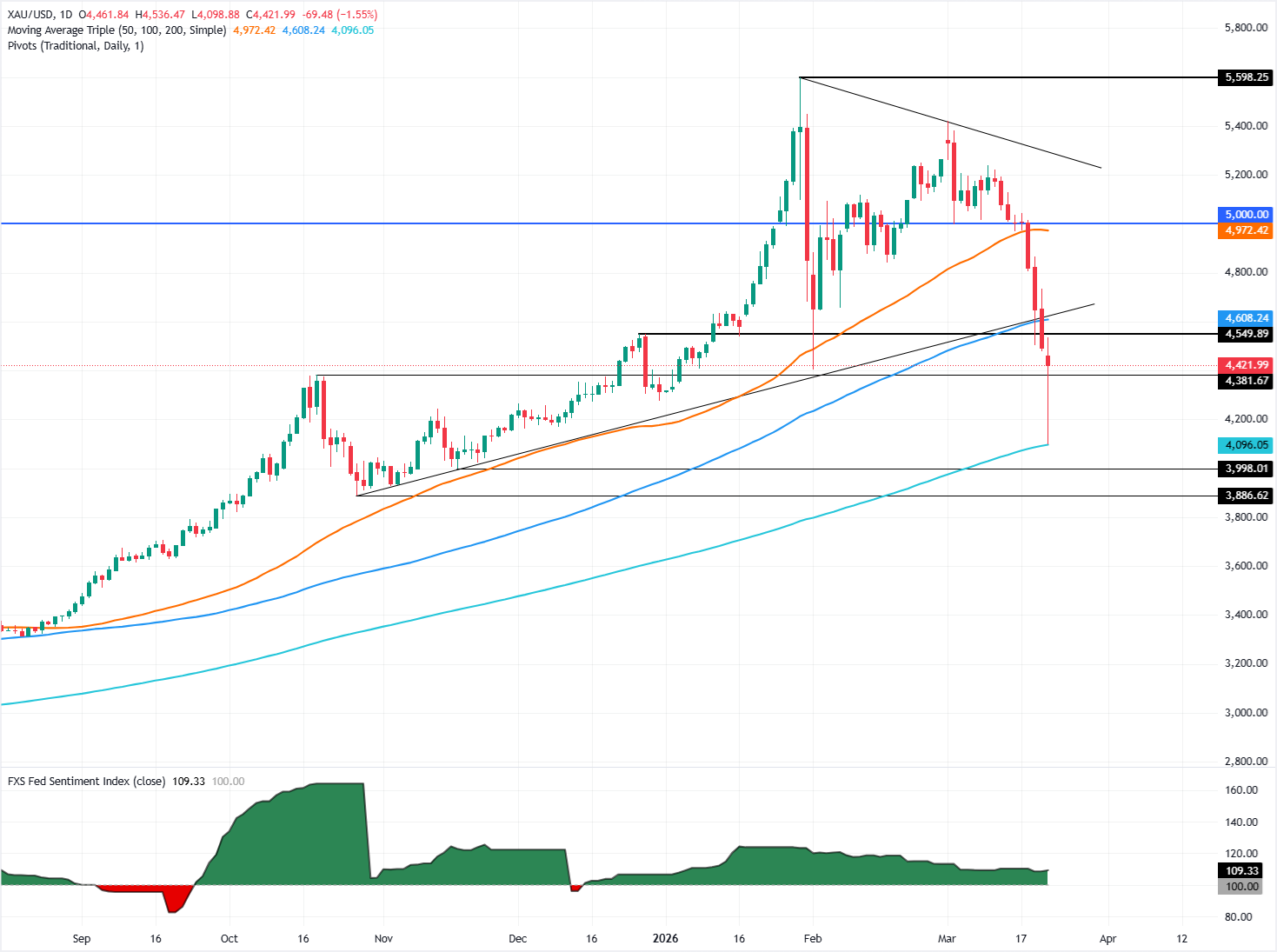 黄金(黄金/美元)周一回吐部分早盘跌幅,但仍下跌近3%,此前曾跌至4098美元,为11月以来最低水平,接近200日简单移动均线(SMA)。