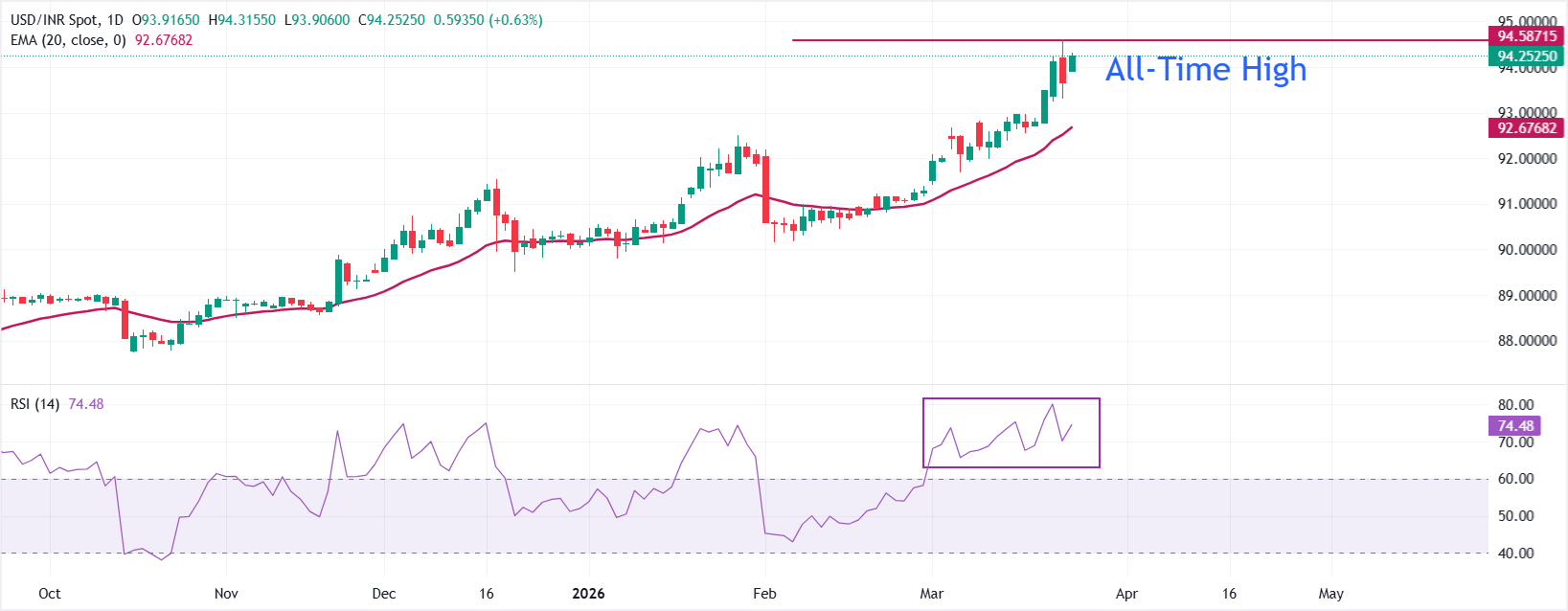 印度卢比(INR)在周二兑美元(USD)走低,此前一天出现强劲反弹。美元/印度卢比汇率从93.30的即时低点回升至接近94.30,因美元在周一大幅回调后重新走强,周一的回调主要受美国总统唐纳德·特朗普宣布将推迟对伊朗电厂的计划军事打击五天的消息影响。