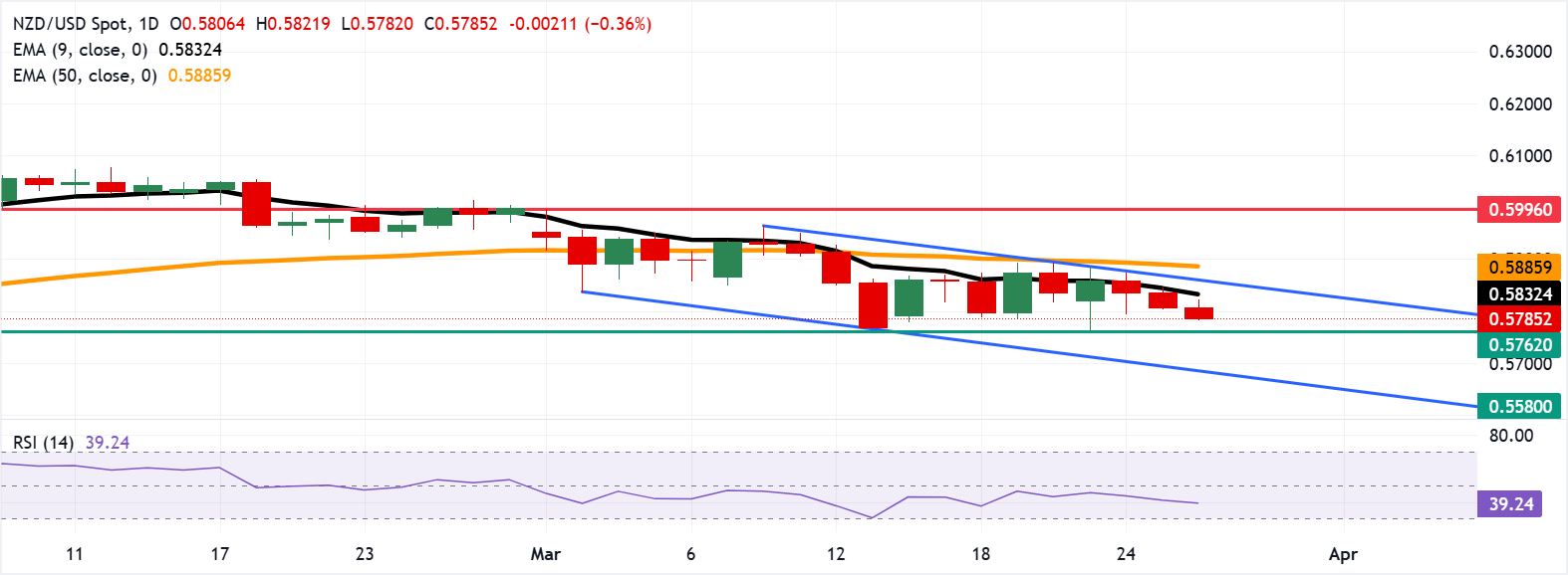 纽元/美元连续第三个交易日下跌,周四欧洲时段交投于0.5780附近。日线图的技术分析显示看跌偏向,因该货币对正盘整于下降通道形态内。