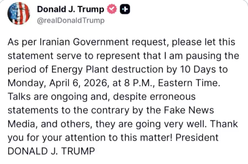 美国总统唐纳德·特朗普周四宣布,将伊朗能源设施的摧毁推迟十天,至4月6日东部时间晚上08:00。特朗普强调,华盛顿与德黑兰之间的谈判“进展非常顺利”,他是在伊朗政府的请求下决定暂停行动的。
