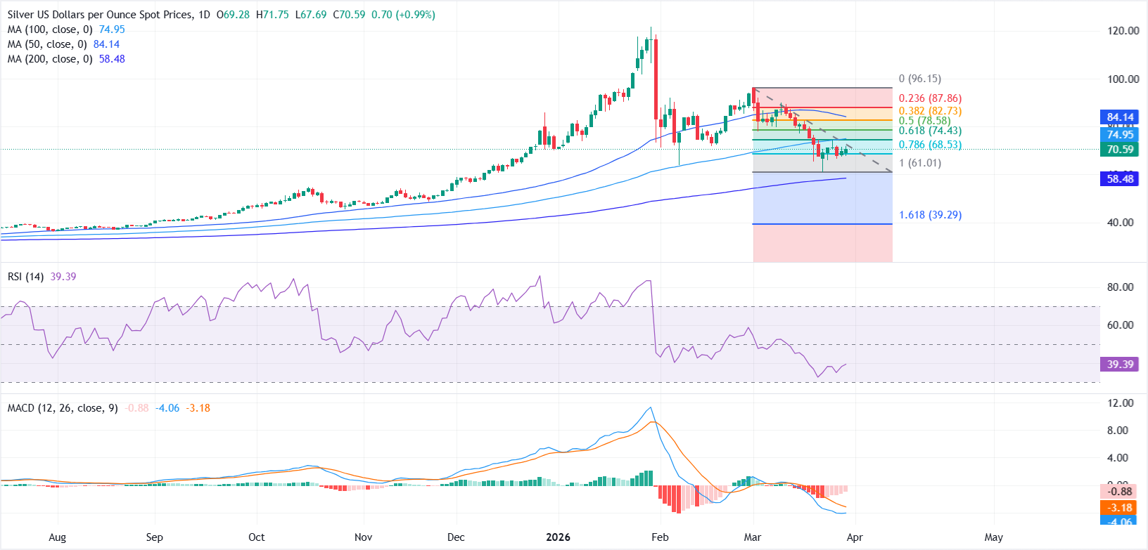 白银(XAG/USD)周一表现强劲,受美国国债收益率回落支撑,交易员重新评估美联储(Fed)的货币政策路径。截至发稿时,XAG/USD交投于约70.50美元,日内上涨近1%。然而,整体走强的美元(USD)限制了后续买盘。