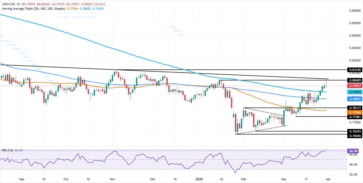 美元/瑞郎(USD/CHF)周二回落,此前触及年内高点0.8042,现徘徊于0.8000关口下方,因中东冲突缓和的猜测升温。撰写时,该货币对报0.7997,涨幅为0.01%。