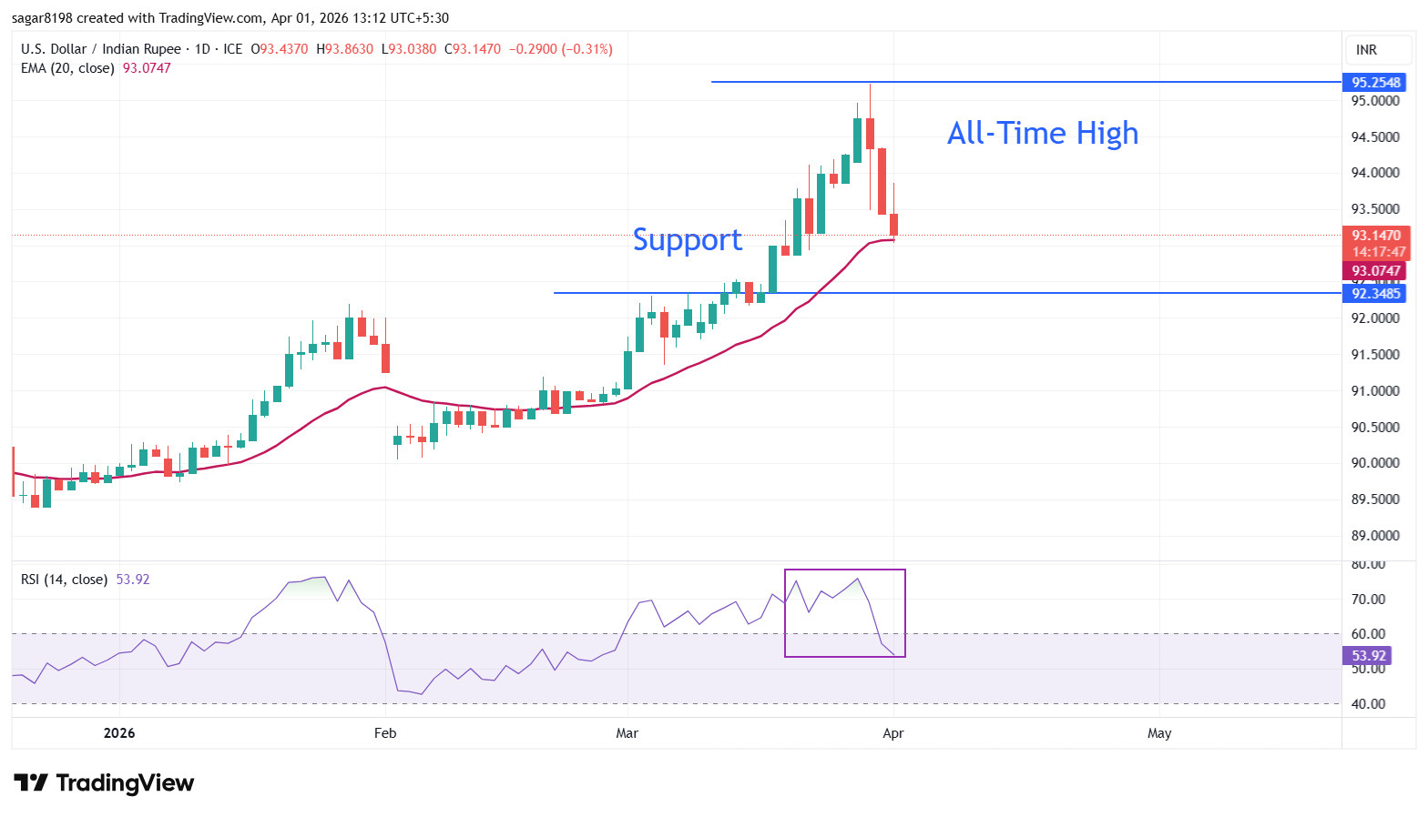 印度卢比(INR)在周三对美元(USD)反弹,此前因前一天的Shri Mahavir Jayanti假期休市。美元/印度卢比(USD/INR)汇率从周一创下的历史高点95.22大幅下跌至接近93.00,因美国和伊朗双方均表示愿意结束战争,中东战争显著降级,提升了风险敏感型资产的吸引力。