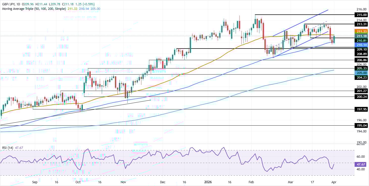 周三,随着市场情绪因对伊朗战争可能结束的猜测而改善,英镑/日元上涨近 0.60%。尽管该货币对在位于 210.08 的 100 日简单移动平均线(SMA)处获得支撑,但在地缘政治不确定性中,市场情绪依然脆弱。