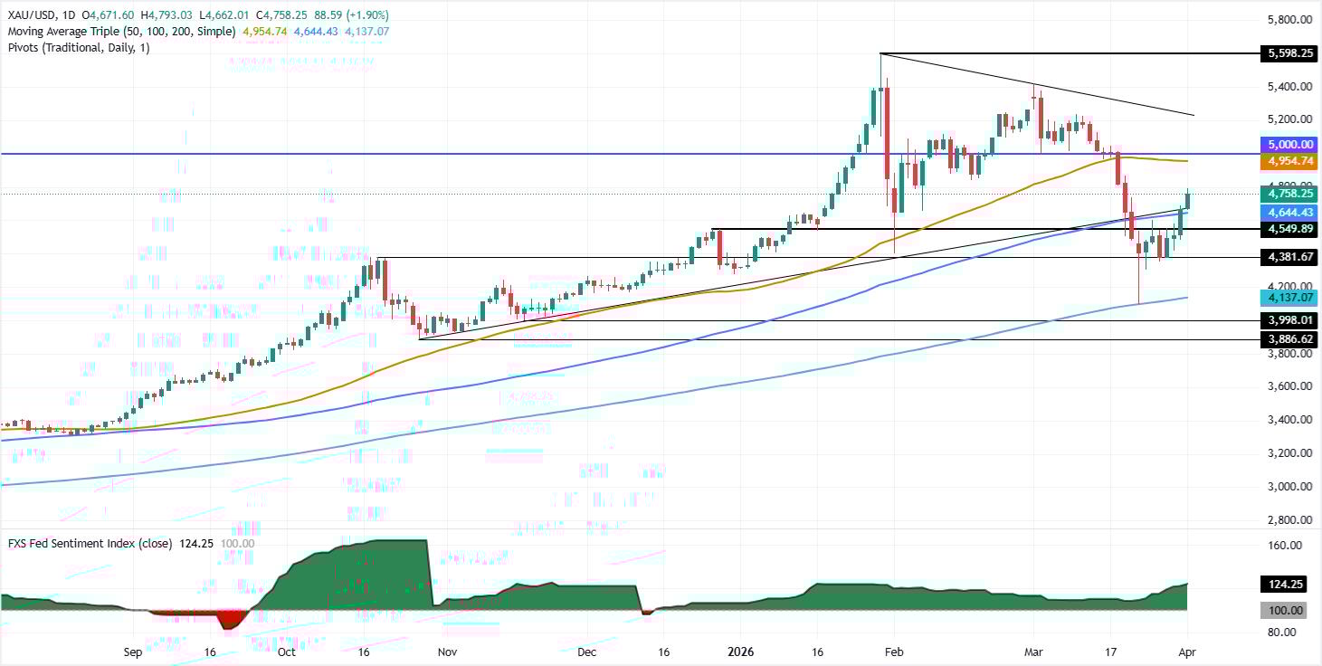 黄金(黄金/美元)价格周三连续第四天上涨,触及近两周高点约4800美元,因美元贬值,市场对中东冲突结束的猜测日益增加。撰写时,黄金/美元报4758美元,涨幅近2%。