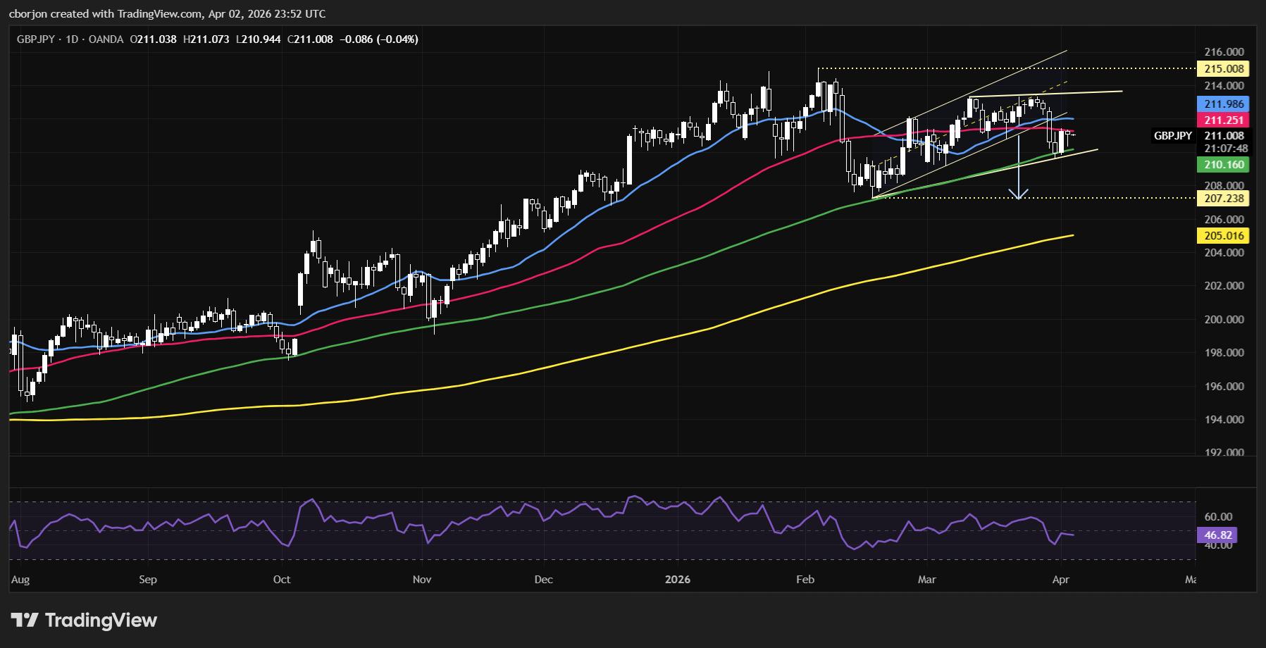 英镑/日元在211.00附近盘整,因美国总统唐纳德·特朗普透露美军任务将延长两到三周后,中东紧张局势加剧,风险偏好转差。