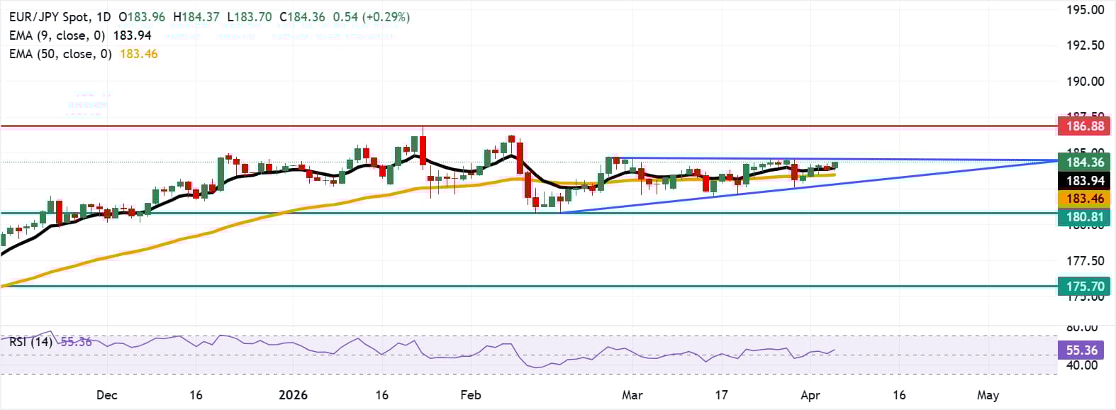 欧元/日元在周一欧洲时段回升,收复了前一交易日的部分跌幅,徘徊在184.40附近。日线图的技术分析显示,该货币对在上升三角形形态内横盘整理,表明处于盘整阶段。若能持续突破三角形上边界,将确认看涨延续。