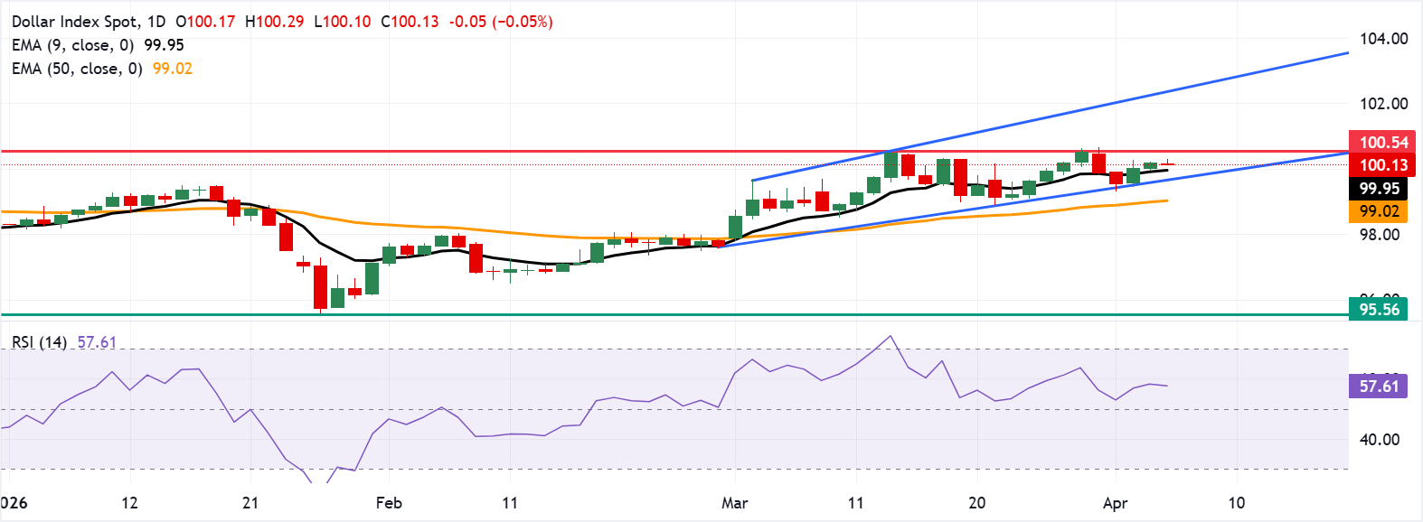 美元指数(DXY)衡量美元(USD)相对于六种主要货币的价值,在连续两天上涨后小幅回落,周一亚洲时段交投于100.10附近。日线图的技术分析显示,美元指数正在上升通道形态内盘整,表明看涨偏好持续存在。