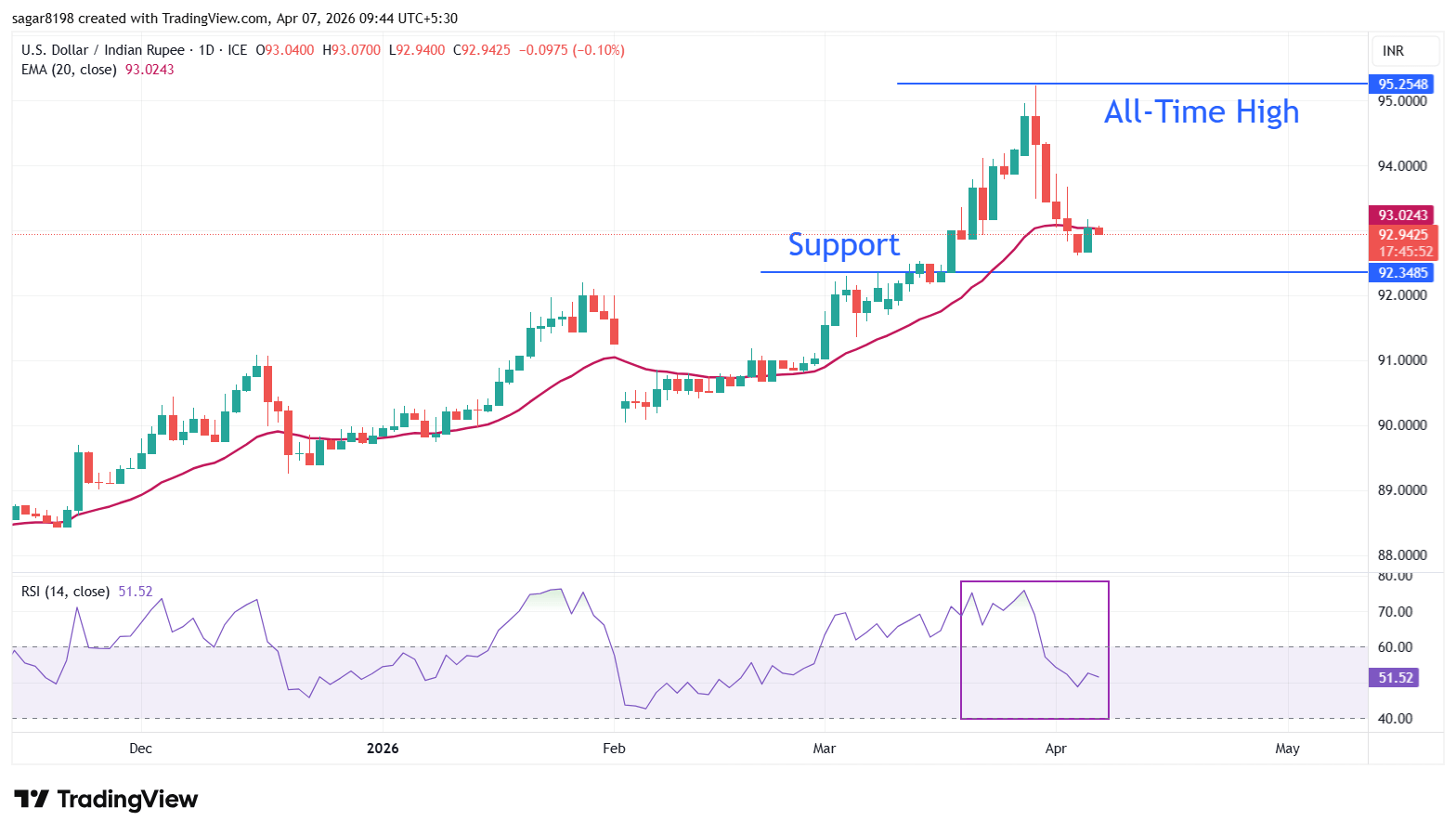 印度卢比(INR)周二对美元(USD)小幅上涨,美元/印度卢比(USD/INR)汇率下跌至接近93.00。由于投资者在美国总统唐纳德·特朗普向伊朗发出的最后通牒之前保持观望,预计该货币对将维持区间震荡。特朗普要求伊朗重新开放霍尔木兹海峡,否则将面临严厉后果,最后期限为4月7日周二美国东部时间20:00,即周三印度标准时间05:30。