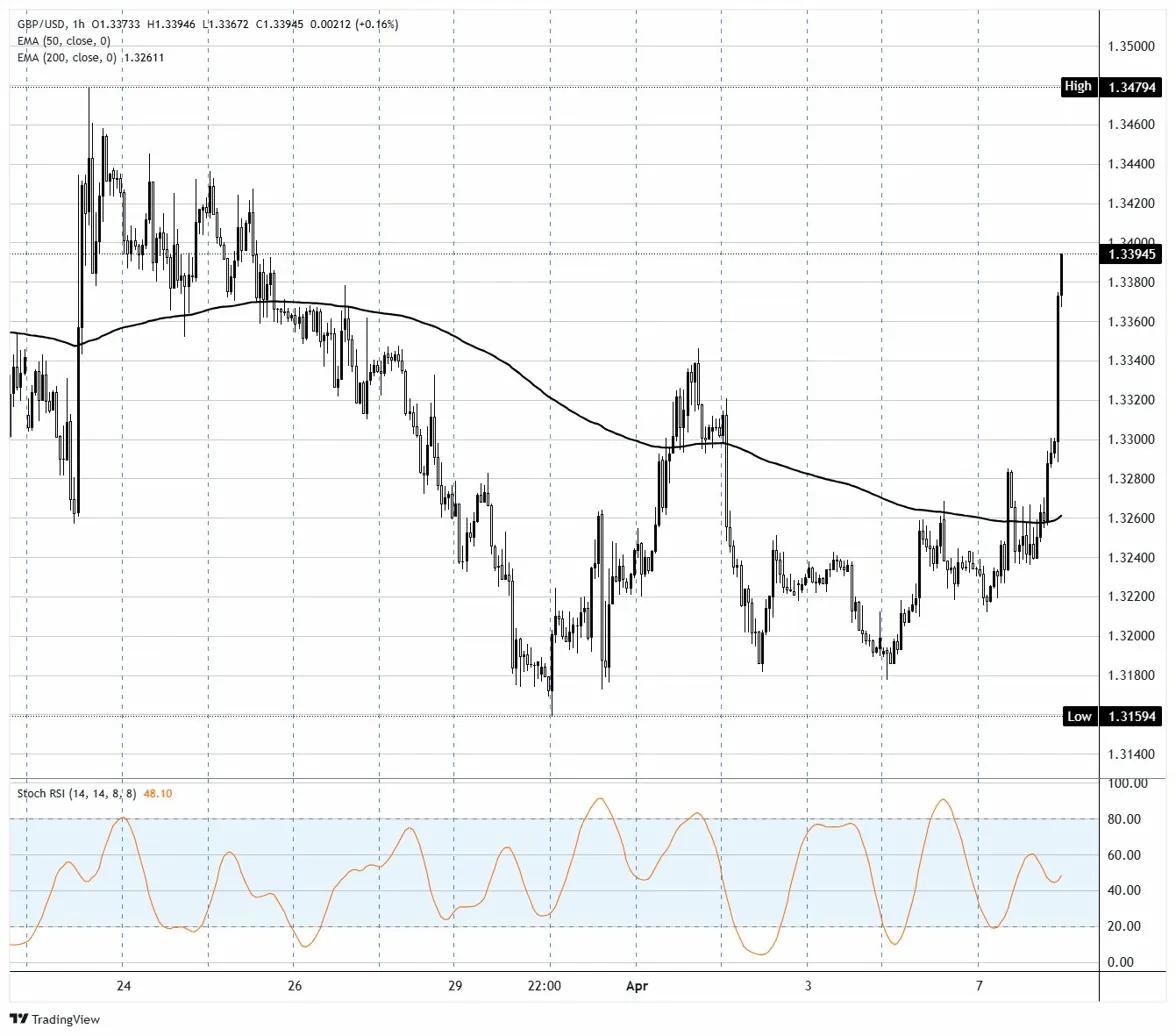 英镑/美元周二大幅上涨,因美国总统特朗普宣布与伊朗达成为期两周的停火协议,引发风险偏好情绪,美元承压下跌。