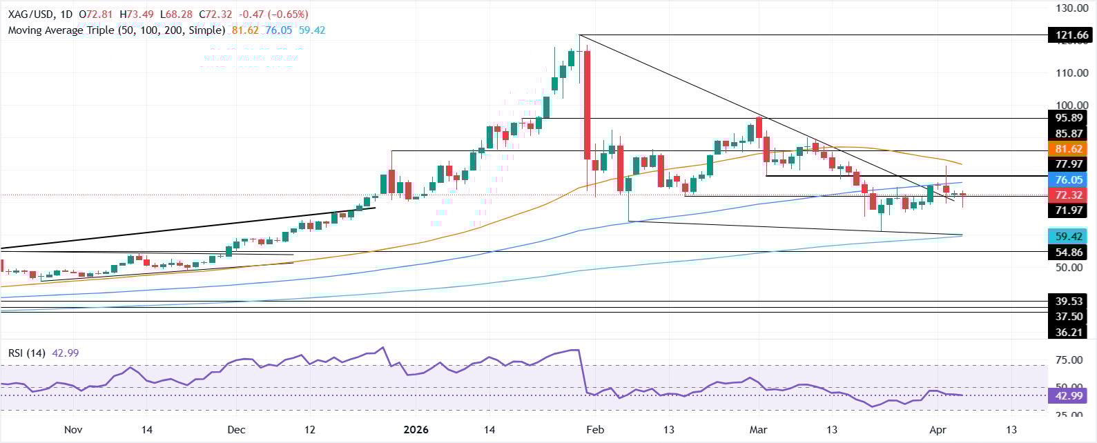 白银(XAG/USD)价格周二延续跌势,因该白色金属未能突破75.00美元关口,同时20日简单移动均线(SMA)下穿100日SMA,显示卖方势力正在增强。撰写时,XAG/USD交投于72.24美元,跌幅为0.69%。