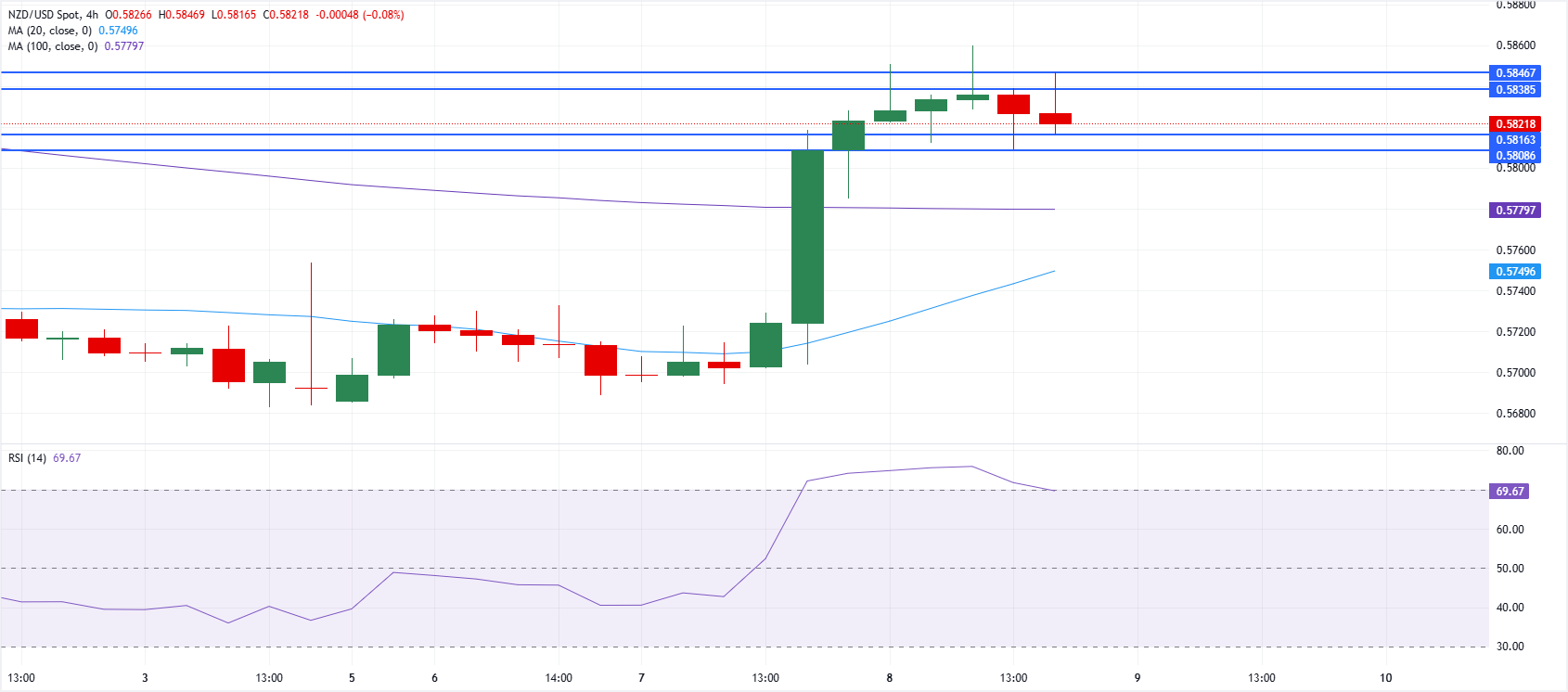 纽元/美元货币对周四在 0.5830 附近谨慎交投,随着地缘政治头条变化,纽元(NZD)重新获得一定动能。