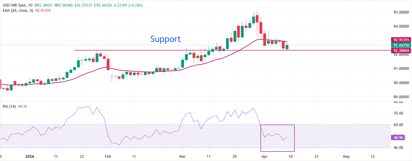 印度卢比(INR)周四开盘交易中兑美元(USD)走低。美元/印度卢比汇率从周三创下的三周低点92.20反弹至接近92.60,此前美国(US)与伊朗宣布停火。