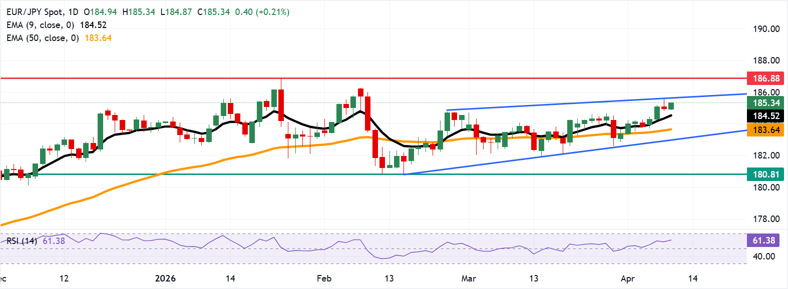 欧元/日元在前一日小幅下跌后反弹,周四欧洲时段交投于185.30附近。日线图技术分析显示,该货币对在上升通道内呈上行趋势,显示出看涨偏向。
