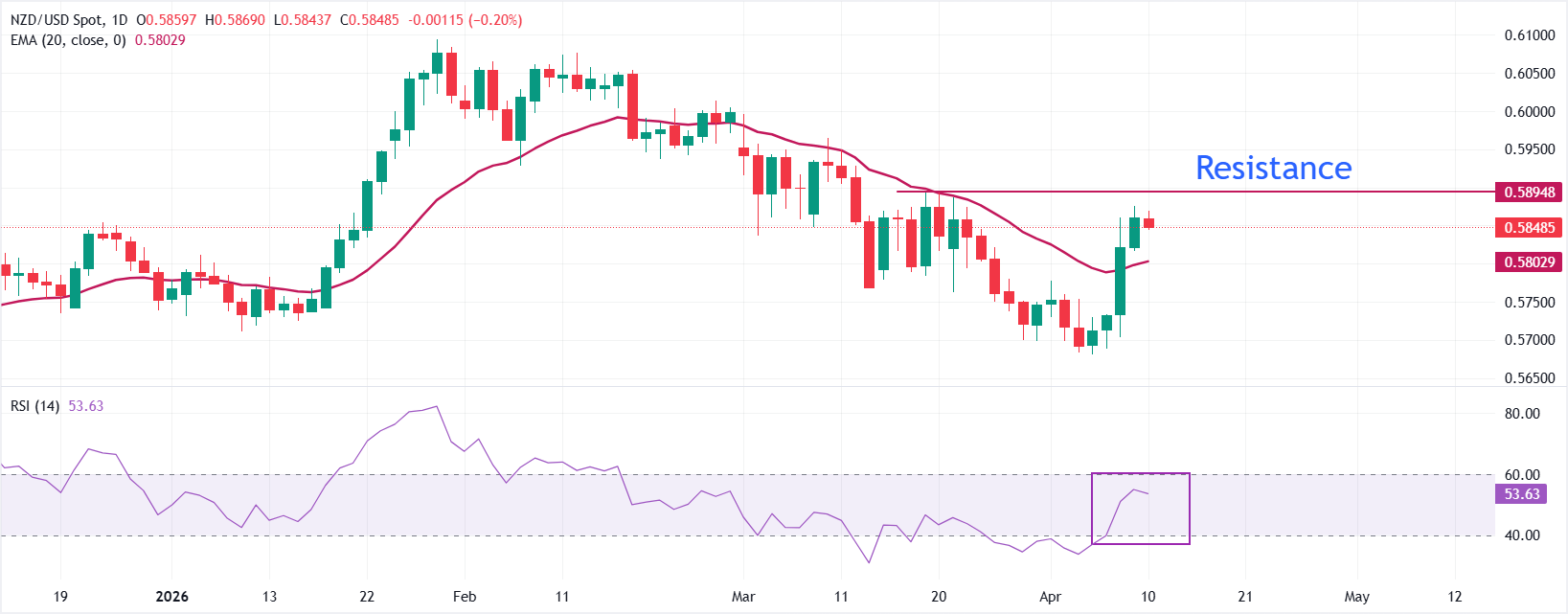 纽元/美元货币对在连续四天上涨后出现回调,周五欧洲早盘时段下跌0.25%,至接近0.5845水平