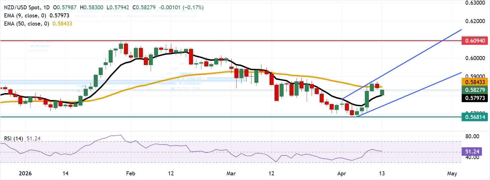 纽元/美元在跳空低开后上涨,周一亚洲时段交投于0.5830附近。日线图的技术分析显示该货币对仍处于新兴上升通道内,暗示看涨偏好。