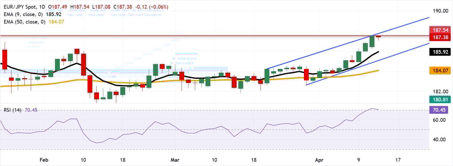 欧元/日元终止三连涨,周二欧洲时段在触及历史高点并徘徊于187.40附近后小幅下跌