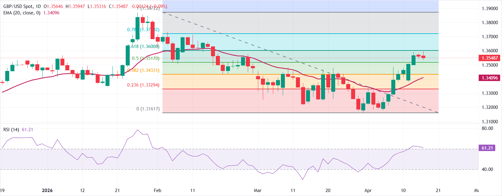 英镑/美元在周四欧洲交易时段下跌0.1%,至1.3545附近,难以延续突破1.3600阻力位的涨势。尽管市场情绪依然偏向风险偏好,但美元(USD)回升,英镑承压小幅抛售。