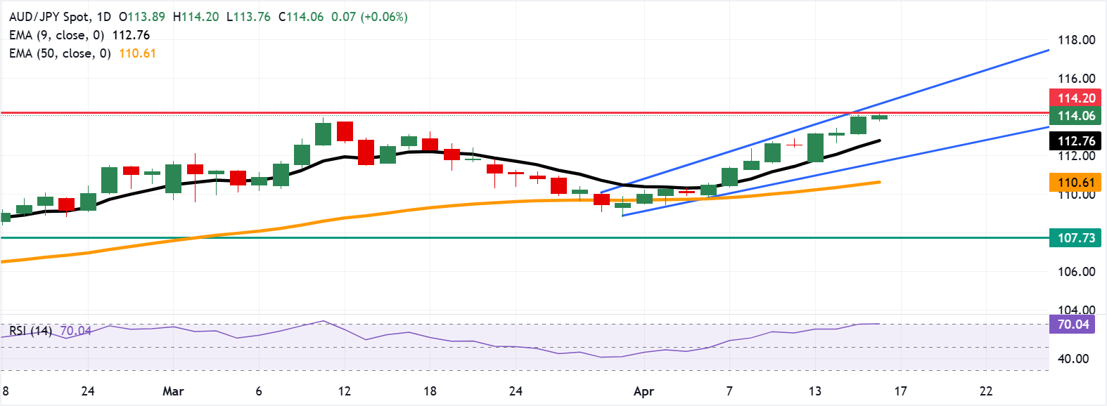 澳元/日元延续自4月6日开始的连胜走势,周四欧洲时段交易于114.10附近。日线图的技术分析显示看涨偏向,该货币对在上升通道内上行。
