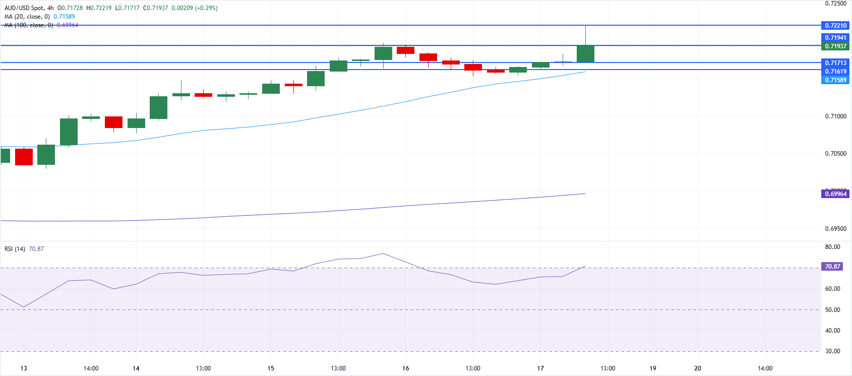 澳元/美元周五飙升至0.7200价格区间附近,中东局势好转的消息打压美元(USD),支撑了澳元(AUD)等风险敏感货币。