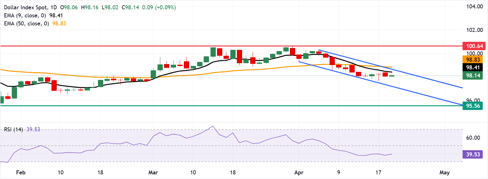 美元指数(DXY)衡量美元(USD)相对于六种主要货币的价值,在前一日录得小幅下跌后持稳,周二欧洲早盘交易于98.10附近。日线图的技术分析显示,美元指数仍处于下降通道形态内,暗示看跌偏向。