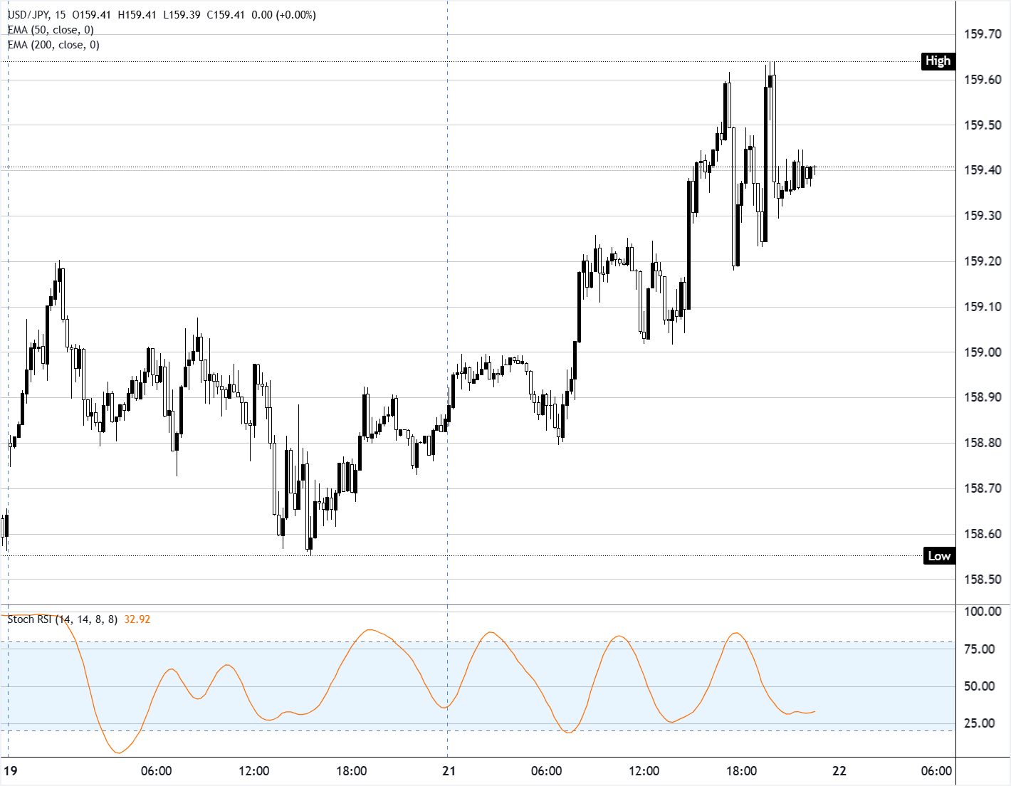 美元/日元周二上涨0.37%,在美国交易时段最高触及159.65后,收于159.40附近。过去几个交易日内,价格在大约158.55至159.65区间内震荡,重叠交易时段出现方向性波动,而在较为清淡的时段则形成更紧凑的小实体K线。