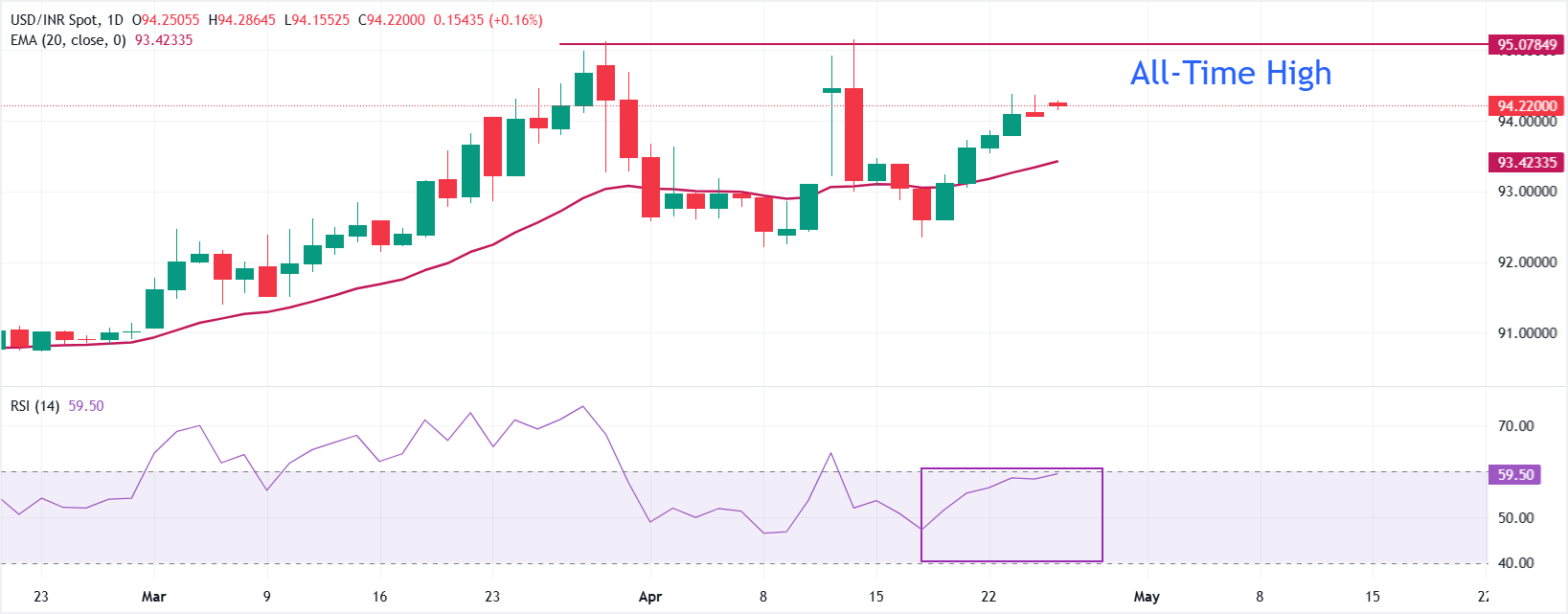 印度卢比(INR)周一开盘对美元(USD)继续承压,维持周度跌势。美元/印度卢比(USD/INR)汇率坚挺交易于94.30附近,油价高企、进口商对美元的强劲需求以及海外投资者在印度股市的加剧抛售成为印度卢比的主要阻力因素。